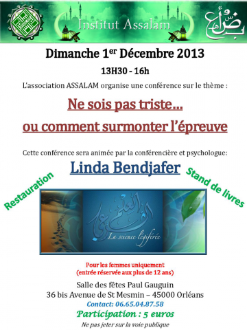 L'association Assalam organise une conférence sur le thème : Ne sois pas triste... ou comment surmonter l'épreuve
