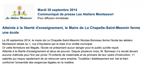 Communiqué de presse Atelier Montessori : Atteinte à la liberté d'enseignement