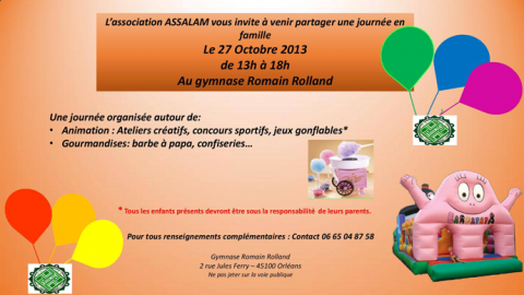 A l’occasion de l'Aid Al Adha, l'association Assalam organise une journée en famille le 27 Octobre de 13H à 18H au gymnase Romain Rolland.