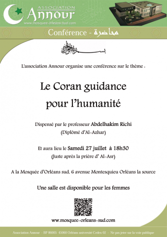 L'association Annour organise une conférence sur le thème : Le Coran guidance pour l’humanité, Dispensé par le professeur Abdelhakim Richi (Diplômé d’Al-Azhar), Et aura lieu le Samedi 27 juillet à 18h30 (Juste après la prière d’ Al-Asr), à la Mosquée d’Orléans sud (Annour), 6 avenue Montesquieu Orléans la source.