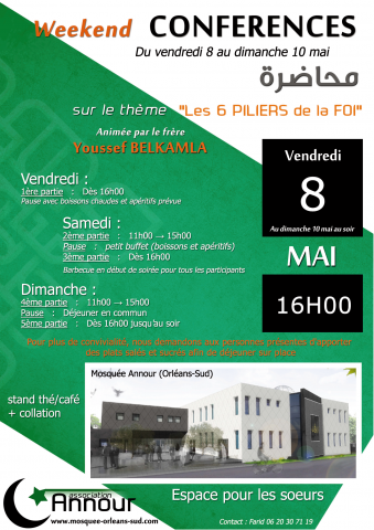Suite à une longue période sans intervenants, c'est avec beaucoup d'émotions que nous vous convions tous (hommes, femmes, enfants musulmans et non musulmans) à cet événement afin de revivifier notre foi lors de diverses conférences ou pour avoir des réponses à vos questions.