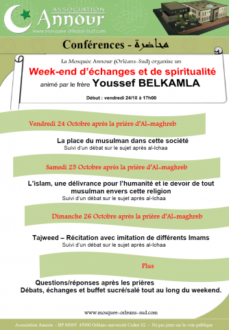 La mosquée Annour a l'honneur d'accueillir, ce week-end, notre cher frère Youssef BELKAMLA pour un week-end de spiritualité.